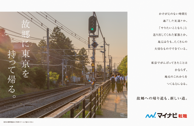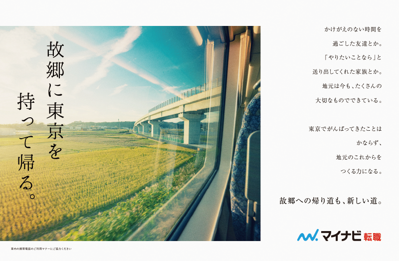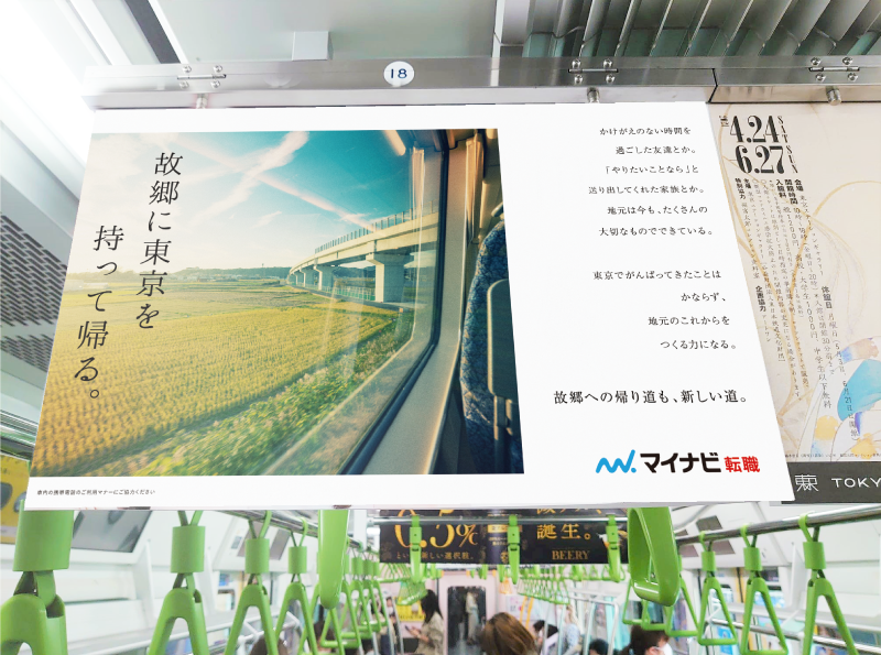 地元へのUIターン(地方移住・転職)を検討する若年層に向けた、交通広告キャンペーンのビジュアルを制作。JRや東京メトロ車内での中吊り広告として展開され、潜在層の「気づき」や「きっかけ作り」を目的とした企画です。